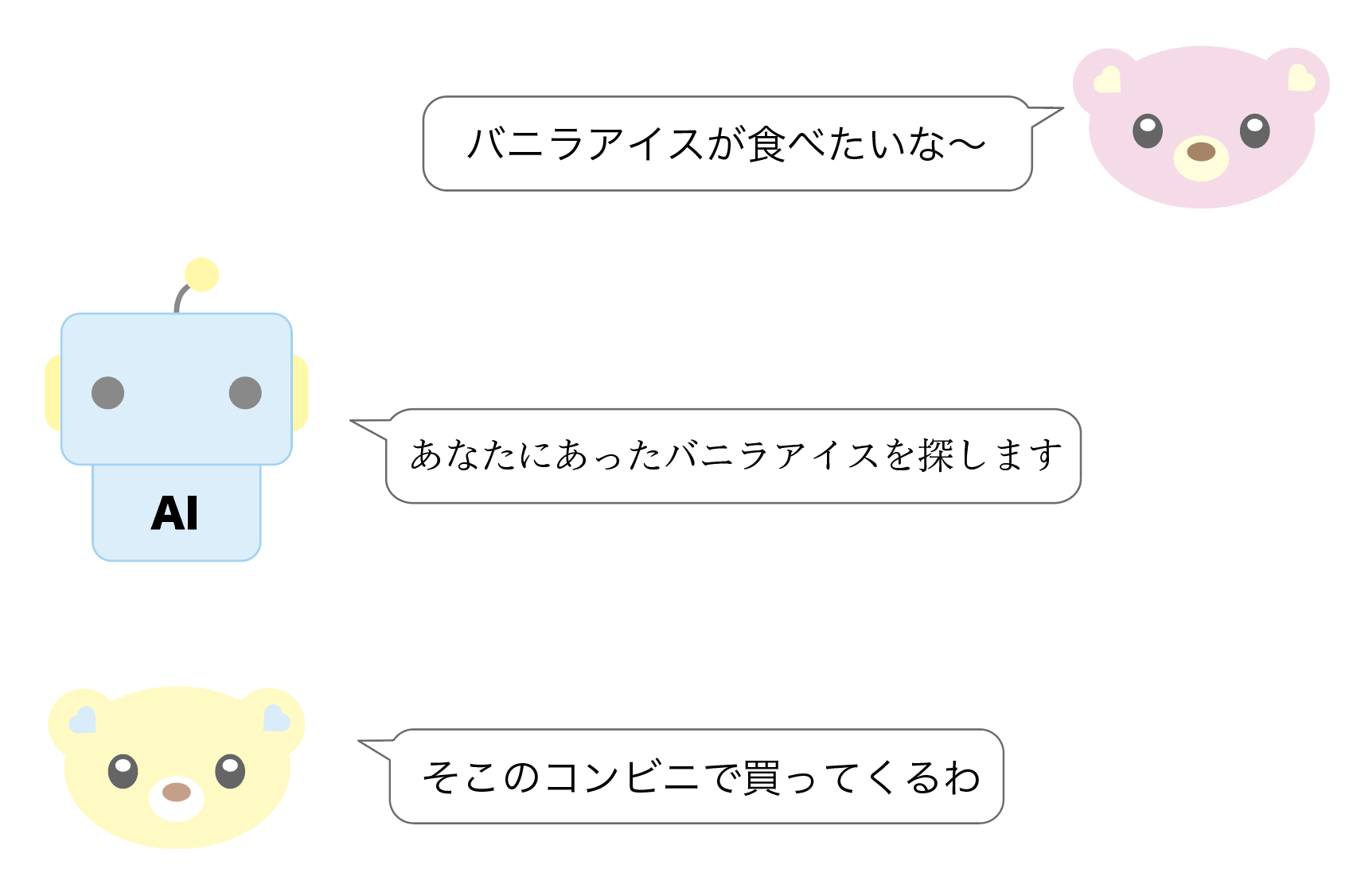 めっちゃ無駄じゃないですか?すぐそこのコンビニで買った方が絶対に早いし、バニラアイスに条件を求めてないこのユーザーからしたら大きなお世話になりますよね。この無駄がある以上AIとユーザーの相性はめちゃくちゃ悪いんです。